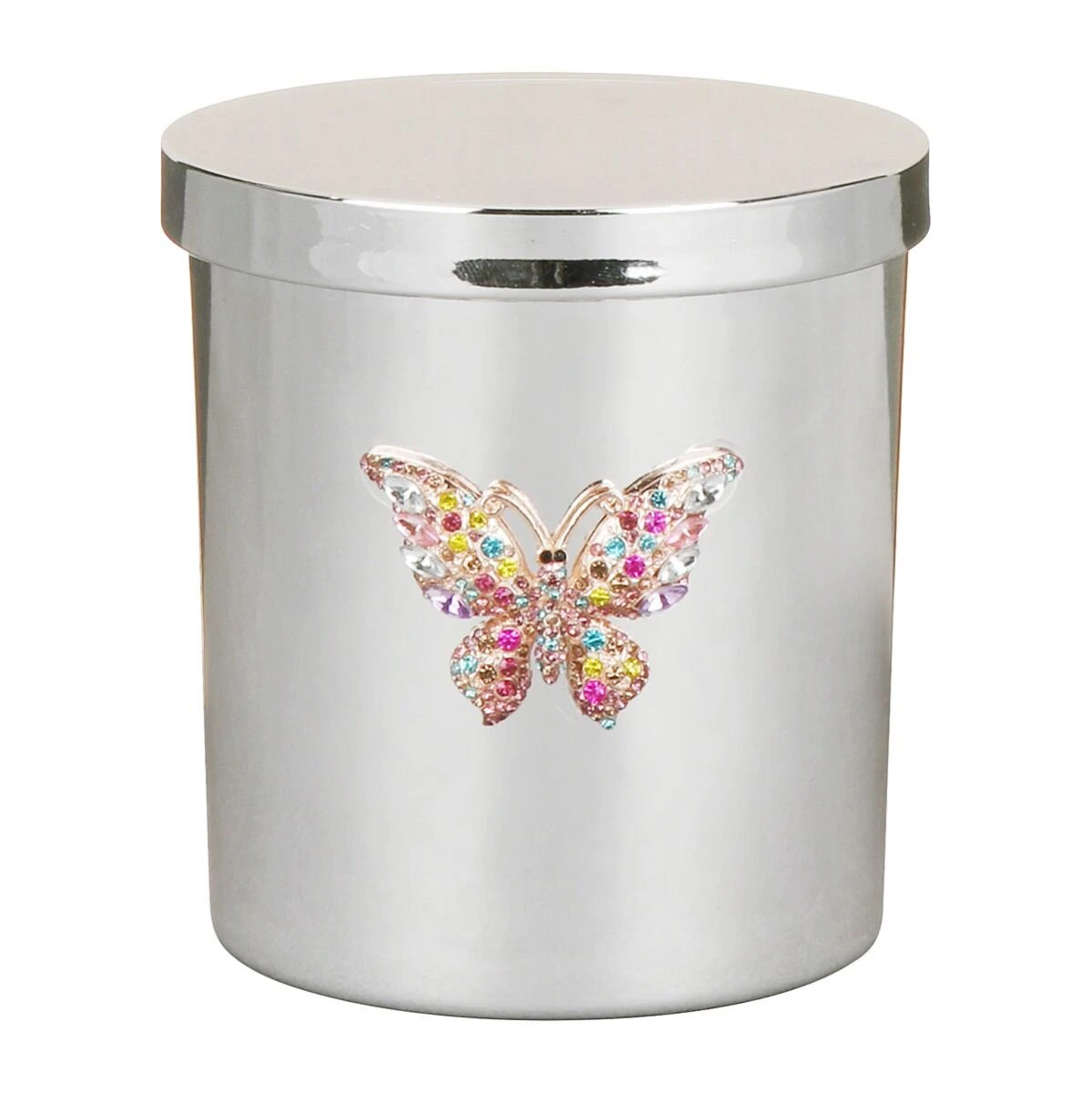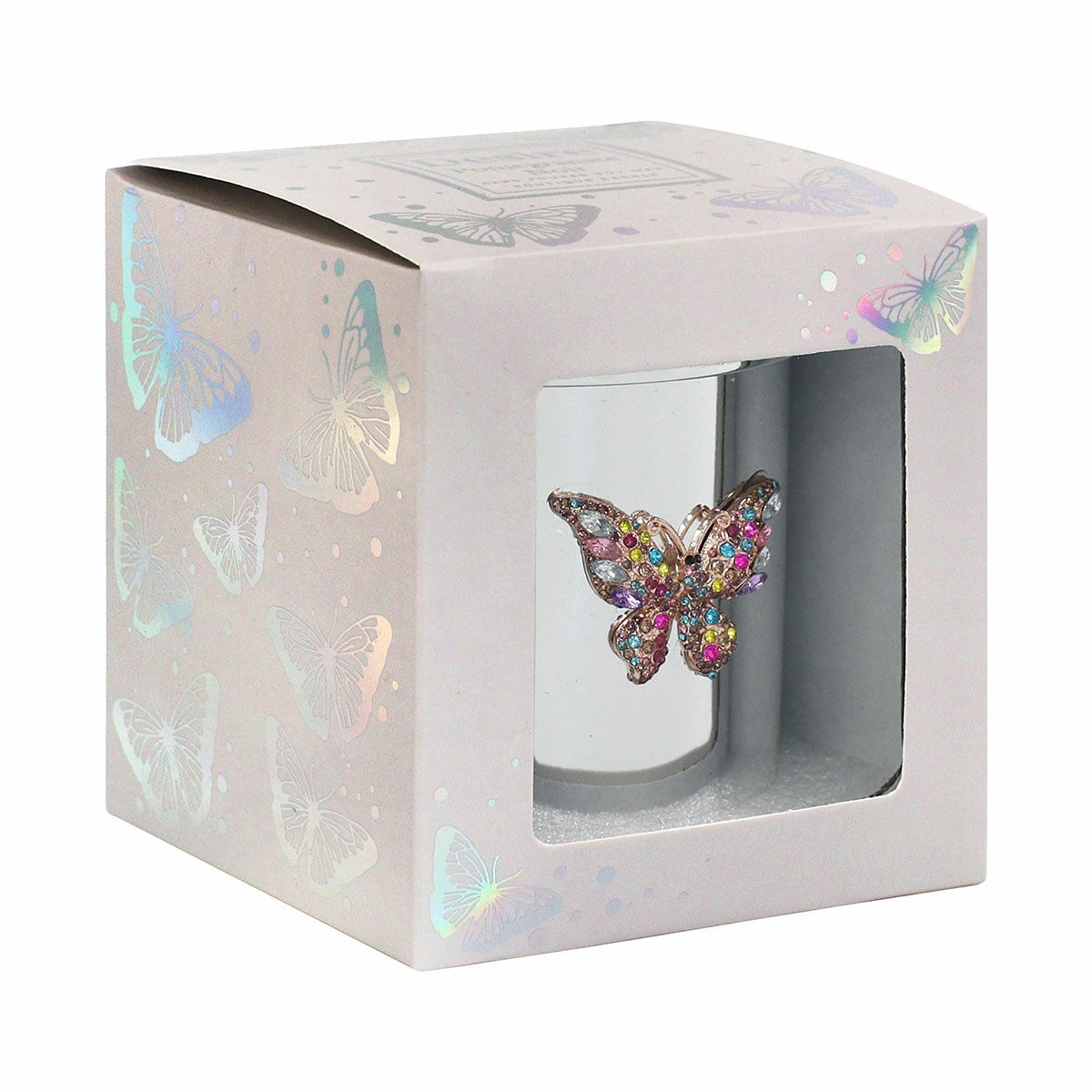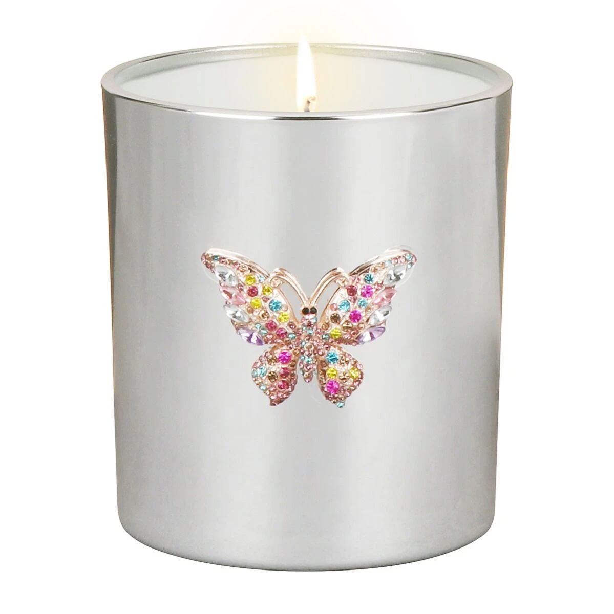 The candle has a burn time of approximately 14 hours and evokes a sense of calm as the fragrance infuses your house with its deep and mysterious scent. Presented in a silver glass jar filled with scented soy wax in a pale cream shade, this candle has a matching silver lid and is ideal for adding a shimmering touch to any room’s décor. The jar is ornate in its design with a rose gold butterfly on the front. The butterfly is embellished with beautiful, colourful diamantes that sparkle in the light.