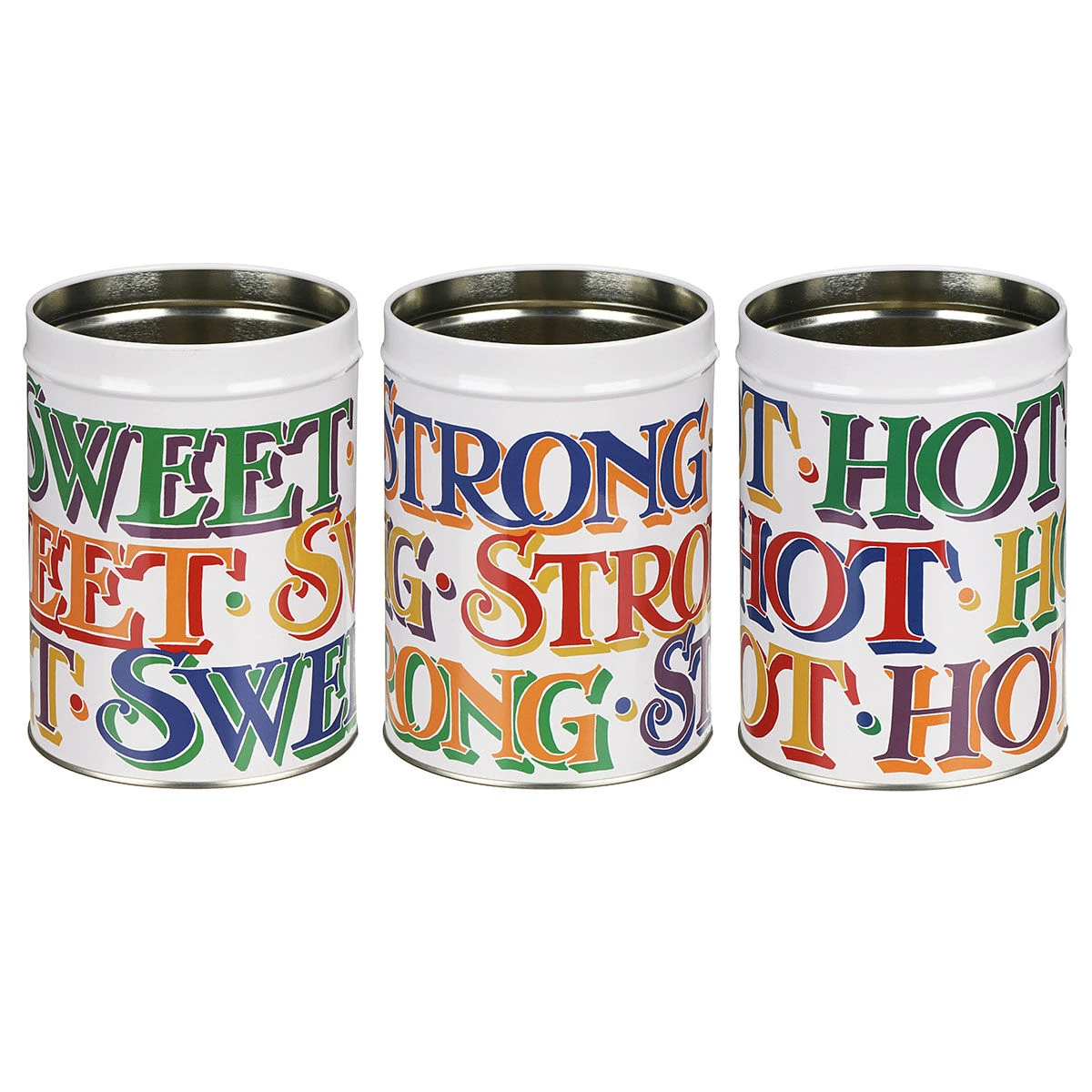 There are three different tins with unique designs, each featuring the stylish Brighter World text repeatedly printed in a range of bold and bright colours. The first tin is printed with the phrase βSTRONGβ, the second reads βSWEETβΒ and the third saysΒ βHOTβ. The designs are scattered across a cream background allowing the patterns to stand out and create a striking look perfect for any kitchen.