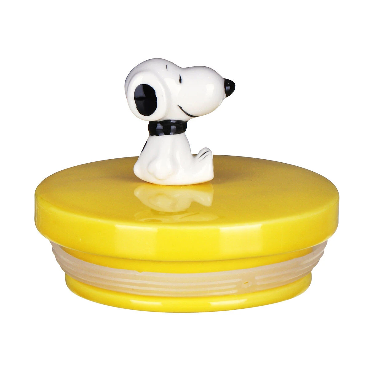 The jar is the perfect size to sit on a dresser or in your cupboard filled with delights. The exterior of the jar is mint green adorned with a scatter pattern of Snoopy in various poses, accompanied by flowers and his yellow bird friend Woodstock. Inside the jar is glazed with a yellow finish, the lid which matches the inside features a rubber seal to keep the contents secure and is complete with a 3D Snoopy character which sits adoringly on top.