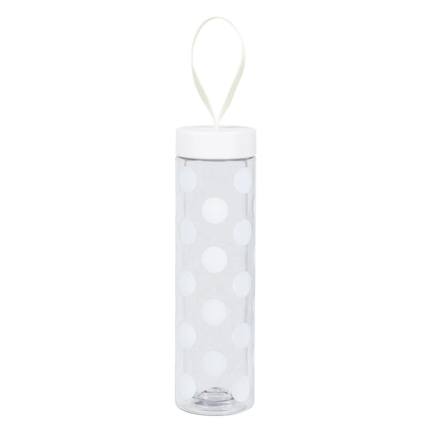 Featuring a white screw top lid with a matching carry strap, this bottle is perfect for carrying around or popping in your handbag. The bottle is decorated with the Jumbo Dot pattern of large white dots on a transparent background.Â