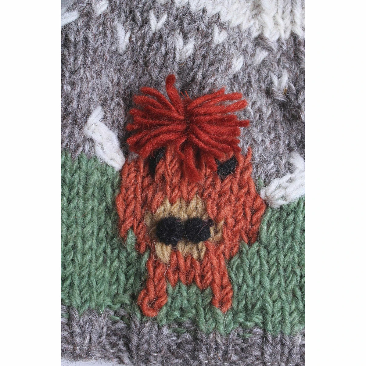 This hand knitted tea cosy is adorned with a ‘herd of highland cows’ made from a fine knit of 100% wool. A row of adorable highland cows adorn the body of this tea cosy all set upon a grey and green which represent a field. The pattern is complete with a fleece-lined soft interior allowing it to sit snugly over your teapot allowing it to brew nicely!