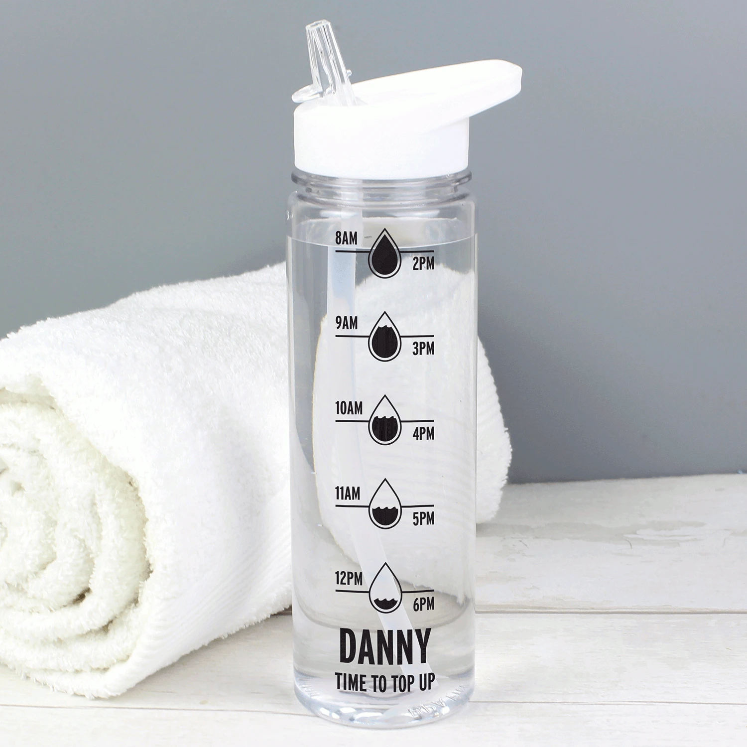Beautifully black, this bottle has a white, twist-on lid with a clear flip top drinking spout and a hanging loop making it easy to carry wherever you’re going. The bottom of the bottle features the words ‘TIME TO TOP UP’ and can be personalised with a name of your choice to give this gift a personal touch.