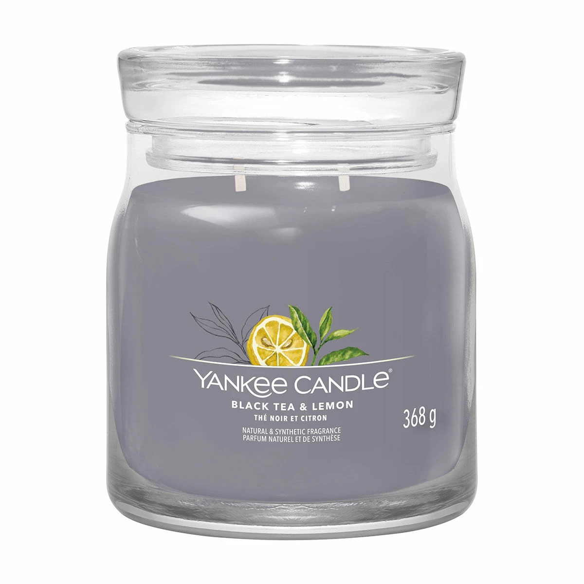 Enjoy the wonderful Black Tea & Lemon fragrance in the wonderful Signature Medium Jar Candle, a sleek glass vessel that compliments the fragrance and will look wonderful in your home. This wonderful aroma from Yankee Candle will fill any room with scents of black tea sweetened with lemon, lime and musky notes.