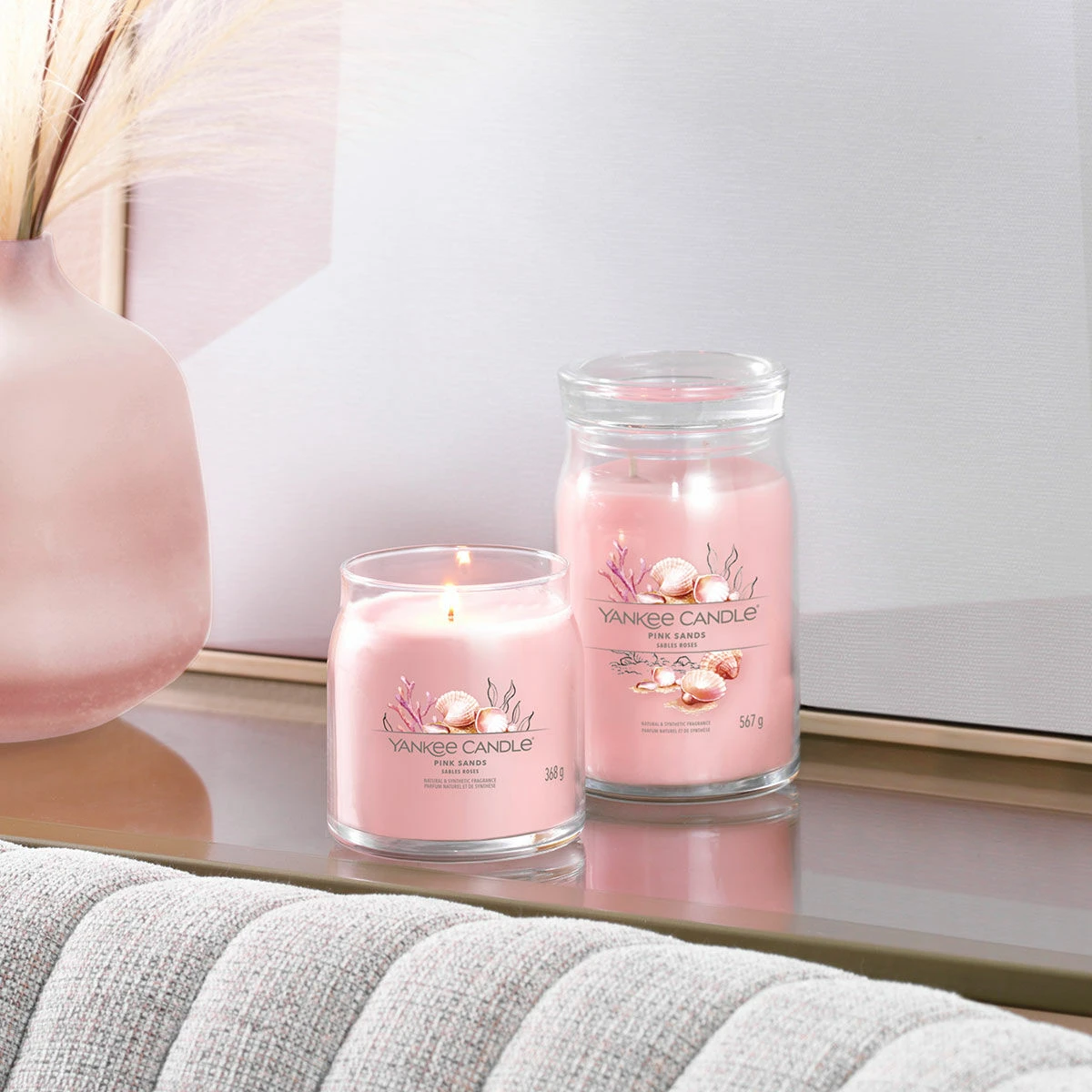 Escape to an exotic island with this gorgeous Pink Sands aroma from Yankee Candle. The sleek glass vessel of this Signature Medium Jar candle compliments the fragrance and will look wonderful in your home.